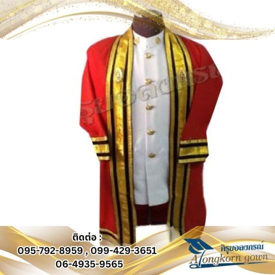 • ให้เช่า และตัด ชุดครุยชุดครุยพระจอมเกล้า เนื้อผ้าทึบ สีแดงหมากสุก แถบสีเหลืองทอง